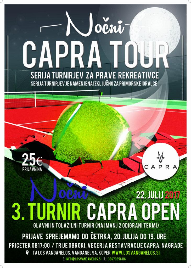 Naj spomnimo, da je serija turnirjev “Capra Tour” namenjena izključno za igralce in igralke primorske regije, kamor štejemo prebivalce obalno-kraške, goriške in primorsko-notranjske regije, brez starostne omejtive, edina omejitev je, da igralec ni bil nikoli v tekmovalnem pogonu oz da ni bil nikoli registiriran kot tekmovalec pod okriljem Teniške zveze Slovenije oz pod kakšno drugo teniško zvezo.