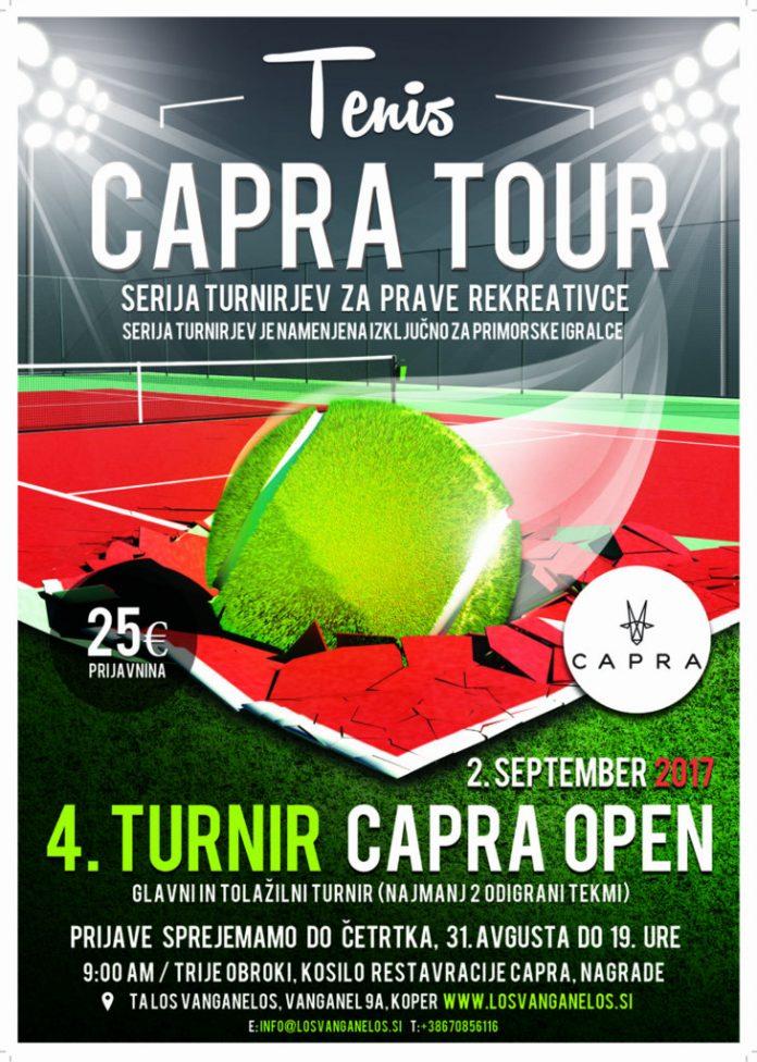 po 3. turnirju, ki je bil prvič v nočni izvedbi, se sedaj vračamo na ustaljene urnike in vas obveščamo, da smo odprli prijave na 4. Capra Open za leto 2017, ki bo na sporedu v soboto, 2.9.2017. Serija turnirjev “Capra Tour” je namenjena izključno za igralce in igralke primorske regije, kamor štejemo prebivalce obalno-kraške, goriške in primorsko-notranjske regije, brez starostne omejtive, edina omejitev je, da igralec ni bil nikoli v tekmovalnem pogonu oz da ni bil nikoli registiriran kot tekmovalec pod okriljem Teniške zveze Slovenije oz pod kakšno drugo teniško zvezo.